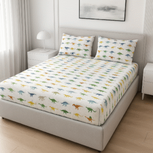 White Dino 100% Cotton Fitted Bedsheet Set – 300TC